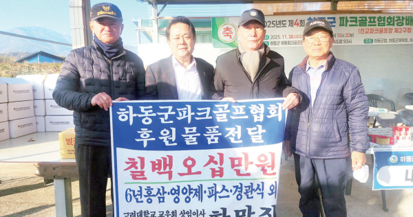 하만진 기부운동엽합회회장은 지 난달 26일 하동파크골프협회를 찾 아 750만 원 상당의 기부물품을 전 달했다. 운동을 하는 데 필요한 파 스와 비타민 영양제, 홍삼드링크 류 등을 주로 전달했다.