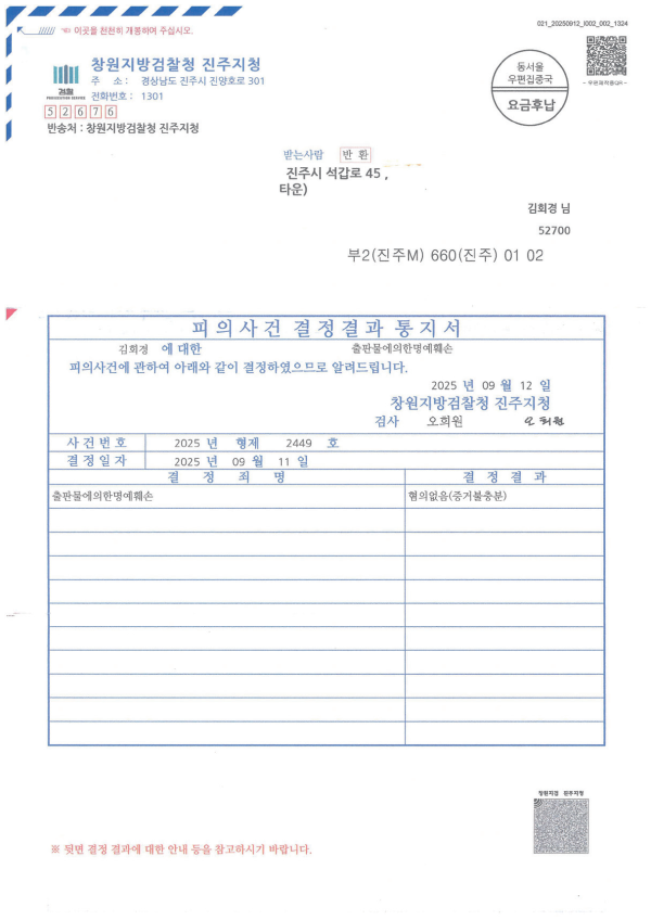 결론은 검찰에서 지난 9월 12일 추가 조사 도 없이 ‘혐의 없음’(증거불충분) 처분을 내 렸다. 혐의없음은 ‘법률상 범죄가 성립하지 않아 처벌할 수 없다’는 결정이다. 하동경찰 서에서의 조사가 사실관계 규명을 벗어난 끼 워맞추기식 억지였다는 해석이 가능하다. 따라서 경찰서의 수사 역량, 법리 해석과 적 용에 있어서 부족한 점이 많았다는 지적을 피할 수 없는 상황이 발생했다. 당시 함께 취 재하고 거의 비슷한 취지로 보도했던 하동 저널 정우석 편집국장도 같은 시기에 검찰에 송치됐으나 같은 날 무혐의 처분을 받았다. 검찰에서 무혐의 처분이란 ‘당초부터 형사처 벌을 전제로 한 수사의 대상이 되지 않는다’ 는 의미다. 그렇다면 이 과정에 하동경찰서 조사관의 수사 역량이 부족해서 초래된 결과 라고만 볼 것인지에 대한 의문이 제기된다. 이 사건을 억지로 기소 의견으로 검찰로 송 치한 배경에 대한 의문은 풀리지 않고 있다. 정상적인 취재와 보도를 통한 견제 기능을 깨부수려는 이른바 ‘언론 말살 또는 탄압’에 가담한 것이라는 의혹을 지울 수 없다.