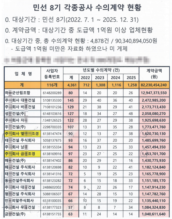 ▌1억 원 이상 수의계약 업체 현황을 연도별로 보면, 2022년 712건, 2023년 1,308건, 2024년 1,116건, 2025년 1258건으로 나타났다. 총 집행한 수의계약 공사 건수는 4,361건에 게약 규모는 822억 원으로 집계됐다.