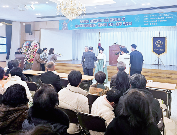 하동문화원(원장 강태진)은 지난 12월 19일 오전 10시 40분, 하동문 화예술회관 소공연장에서 ‘2025 하 동문화원 송년 문화행사’를 개최했 다.