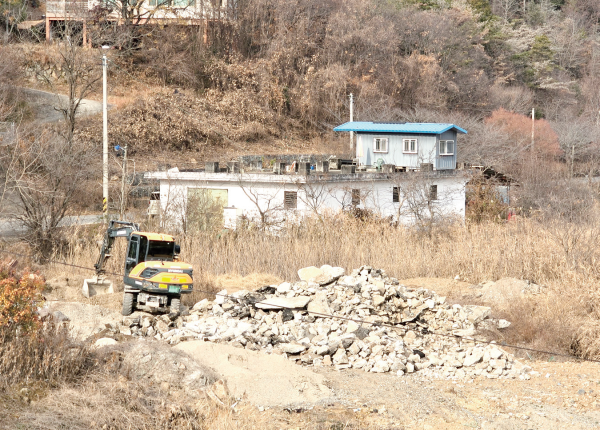 본지가 현장을 찾아가 사진을 찍었 더니, 콘크리트 부스러기와 철근이 섞인 구조물 파편, 나무토막, 기타 폐기물 등이 섞여 있었다.