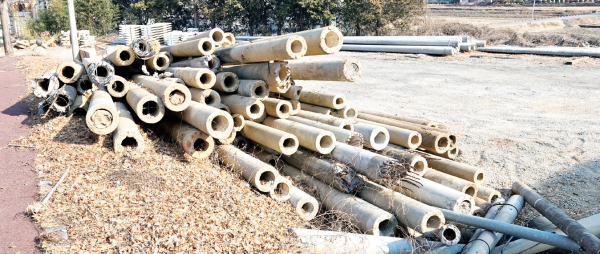 농업기술센터 입구 도로변 공터에 수백 개 시멘트 전주 버려져
