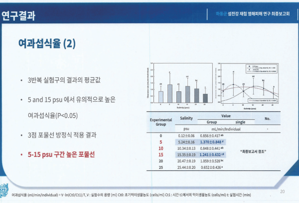 한국수산증‧양식 기술사협회 김 병기 박사팀이 주도한 이날 용역 발표회에서는 재첩이 가장 잘 서 식할 수 있는 염분 농도는 12.5에 서 15 psu 미만이라는 자료가 나왔다.