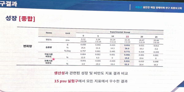 이 연구에서는 영산강유역청 등의 용역자료와는 달리, 염분농도 15psu에서 재첩 생산성과 비만도 등 생육상 태가 가장 우수한 것으로 나타났다.