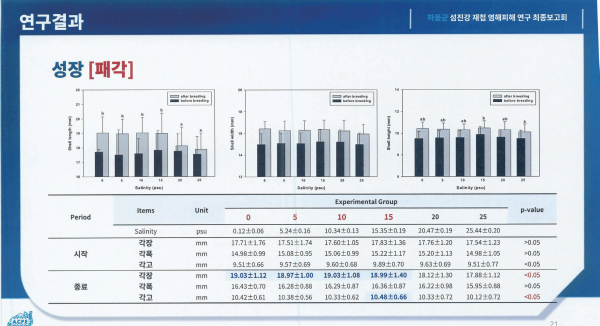 이날 발표한 주요 내용은 재첩은 12.8에서 15psu의 염 분 농도에서 서식이 가장 활발하고, 그 이상과 이하에 서는 먹이 활동과 그에 따른 성장이 불량하고 결국 폐 사율이 높아진다는 요지가 도출됐다.