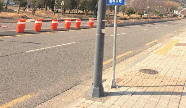 둘레가 큰 가로등 쇠 기둥 뒤에 숨어 있기 때문이다. 두 기둥의 거리는 고작 30cm에 불과하다. 그러다 보니 운전자가 횡단보도 표지판을 볼 수 가 없다.