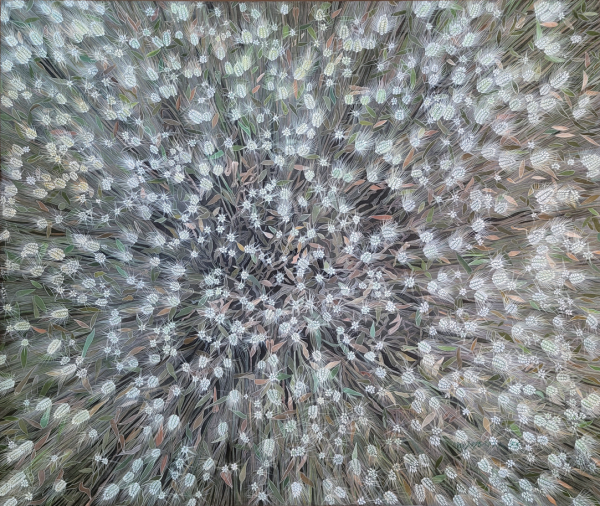 이 작품은 평사리 보리밭을 주제와 소재로 삼았 으며, 공중에서 보리밭을 조명하는 구도로 그려 졌다. 민화식 기법으로 장지에 그려진 구상기법 의 채색 한국화다. 구상은 자연과 식물, 동물 등을 기초로 작가의 상상을 더한 기법으로 그린 미술작 품을 말한다.