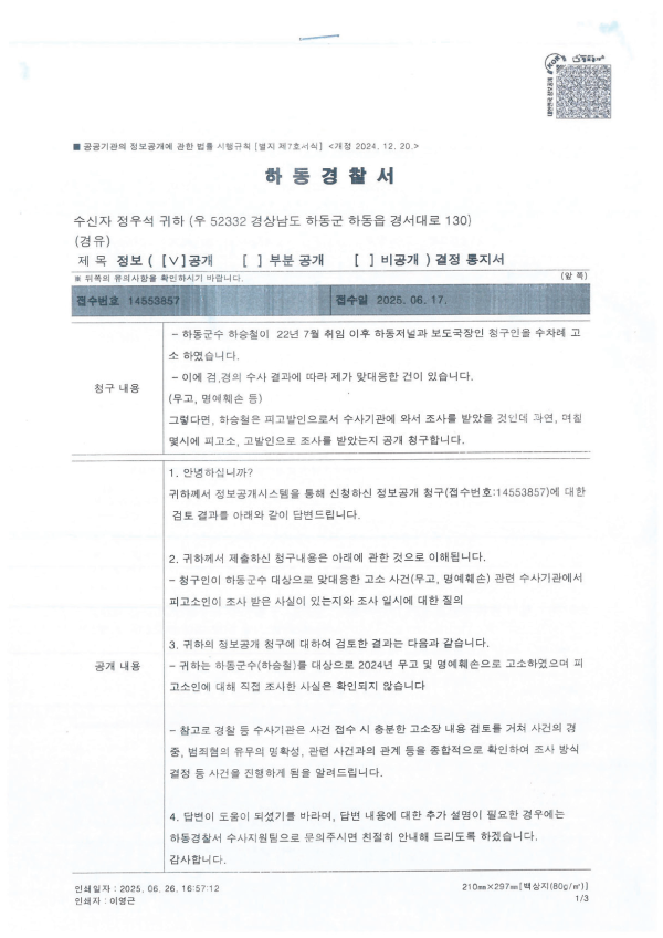 하동저널 정우석 국장이 ‘이들 사건과 관련 해서 하승철 군수가 피고소인으로서 경찰서 에 출석해서 조사를 받은 바 있는지’ 정보공 개청구를 했더니, ‘그런 사실 없습니다’ 라는 답변을 받은 바 있다고 알렸다. 본지가 피고 소인으로 지목한 하승철 군수가 경찰 조사 를 받기 위해 출석한 사실이 없다는 의미로 이해된다.