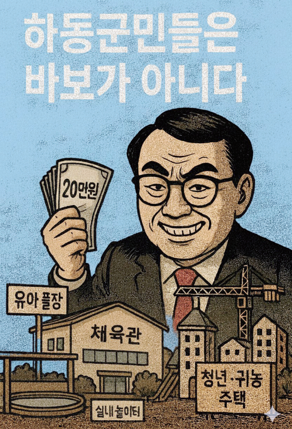 게다가 그마저도 선거를 앞두고 “군민 1인당 20만 원”이라는 일회성 지원으 로 이름만 '민생안정'인 매표(買票) 행정을 펼치려 하고 있으니, 군민의 분노 는 커질 수밖에 없다. 군민들은 묻는다. “우리를 이렇게 달래서 표를 얻겠다 고 생각하는가?” 하동군민은 그렇게 어리석지 않다.