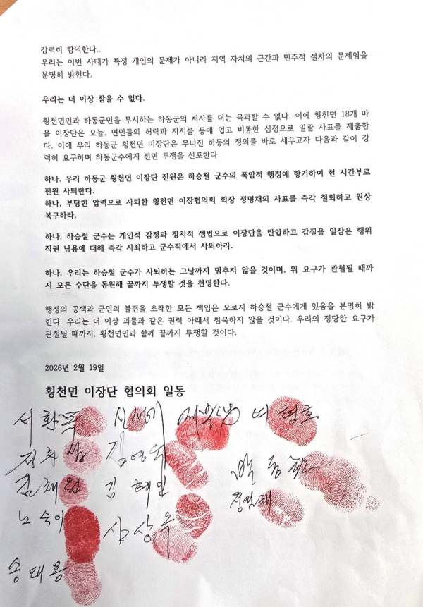 ▮2026년 2월 19일 설 연휴가 끝난 첫날 하동군 횡천 면 이장 18명이 일괄 사퇴를 선언했다. 이날 오전 횡천 면 사무소 회의실에는 횡천면 이장과 군의원, 취재진과 주민 등 100여 명이 모였다.