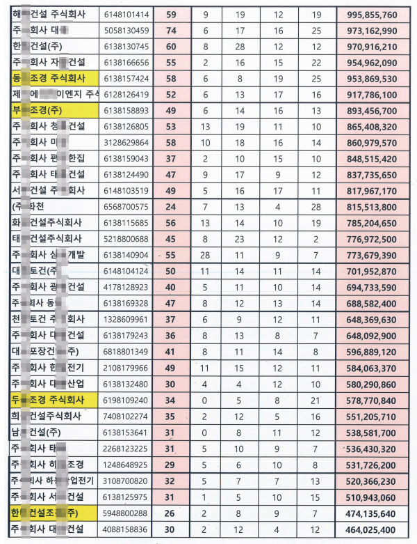 이밖에 평◯건설 67건에 11억 4천만 원, 인◯피알 66건 에 11억 3천만 원, 우◯건설 57건에 10억 8천만 원, 금◯ 건설 63건에 10억 4천만 원, 해◯건설 59건에 9억 9천만 원, 주식회사 대◯ 74건에 9억 7천만 원, 한◯건설 60건 에 9억 7천만 원 등이다.