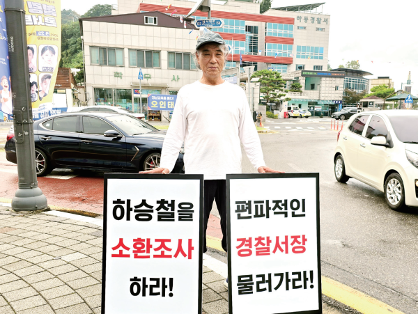 피케팅 내용은 “하승철을 소환조사하라”, “ 편파적인 경찰서장 물러가라“라는 내용이 적혀 있다.