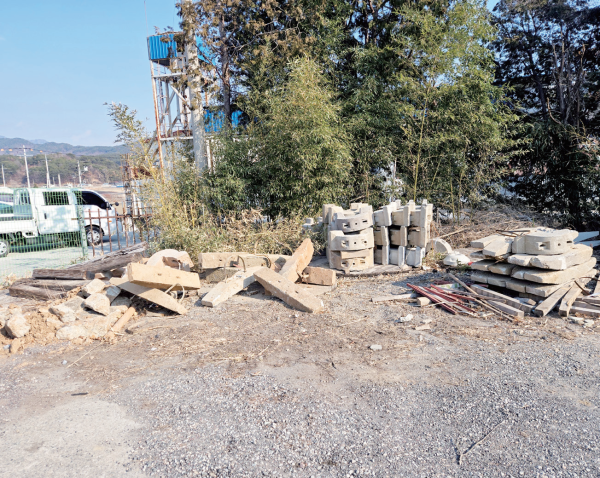 하동군 적량면 농업기술센터 진입로 앞 공터에 폐시멘트 전주와 전주 고정용 콘크리트 구조물, 기름 묻은 나무 굉목 등 각종 폐기물이 다량 방치돼 있다.