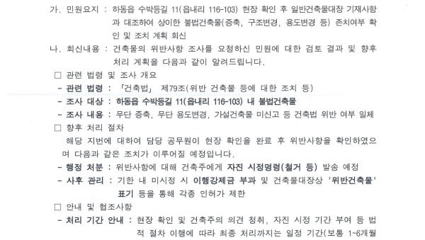 “위반 사항에 대해 건축주에게 자진 시정명령(철거 등) 발송 예정”