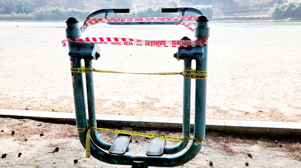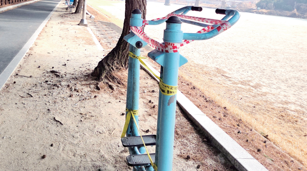 하동읍 송림 공원에 가면 여러 가지 운동 시설이 설치돼 있다. 하지만 고 장이 나 사용할 수 없는 상태로 방치 되고 있다. 송림 공원 가장 자리 백사장이 보이는 곳에 설치돼 있어 송림에 들어는 순간 눈에 띄는 곳이다. 현재 접근을 금지하는 마스킹 테이프가 둘러쳐져 있다. 보는 이들의 눈살을 찌푸리게 한다.